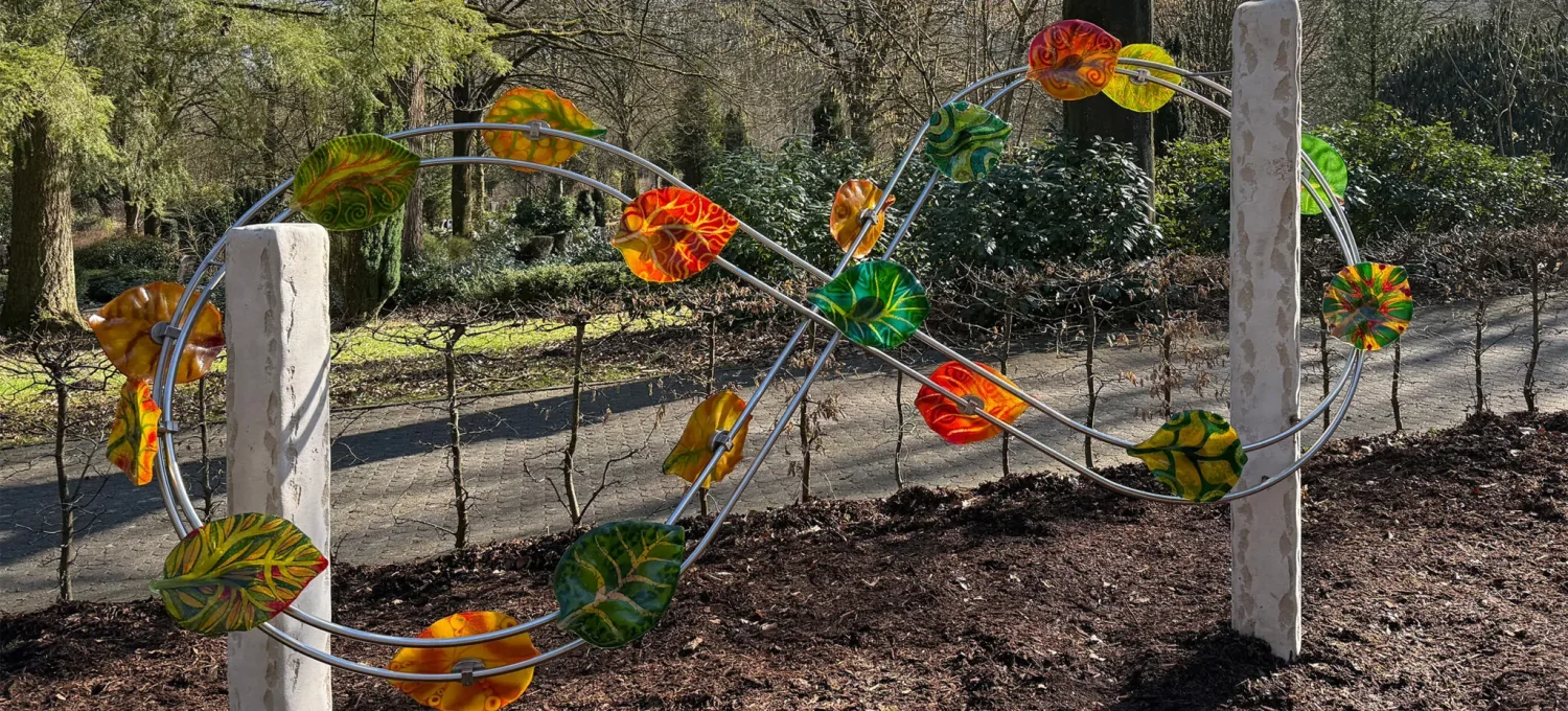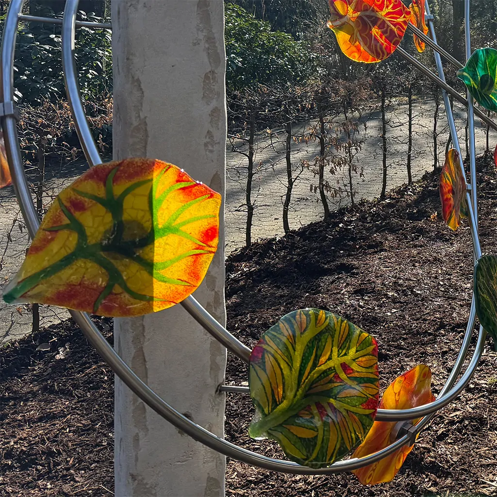 Angehörige haben das Kunstwerk in Auftrag gegeben. Achtzehn Glasblätter werden von einer Konstruktion in Form einer liegenden Acht, dem Symbol für Unendlichkeit, getragen.