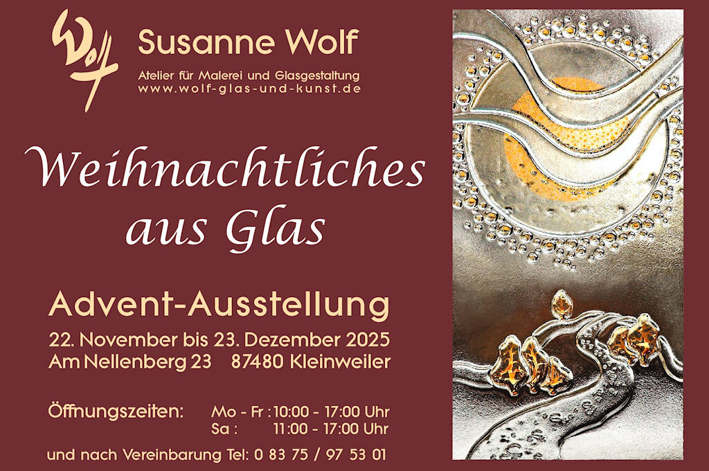 Die Ausstellung „Weihnachtliches aus Glas“ ist bis zum 23. Dezember geöffnet mit verlängerten Öffnungszeiten: Mo-Fr 10 – 17 Uhr, Sa 11 – 17 Uhr