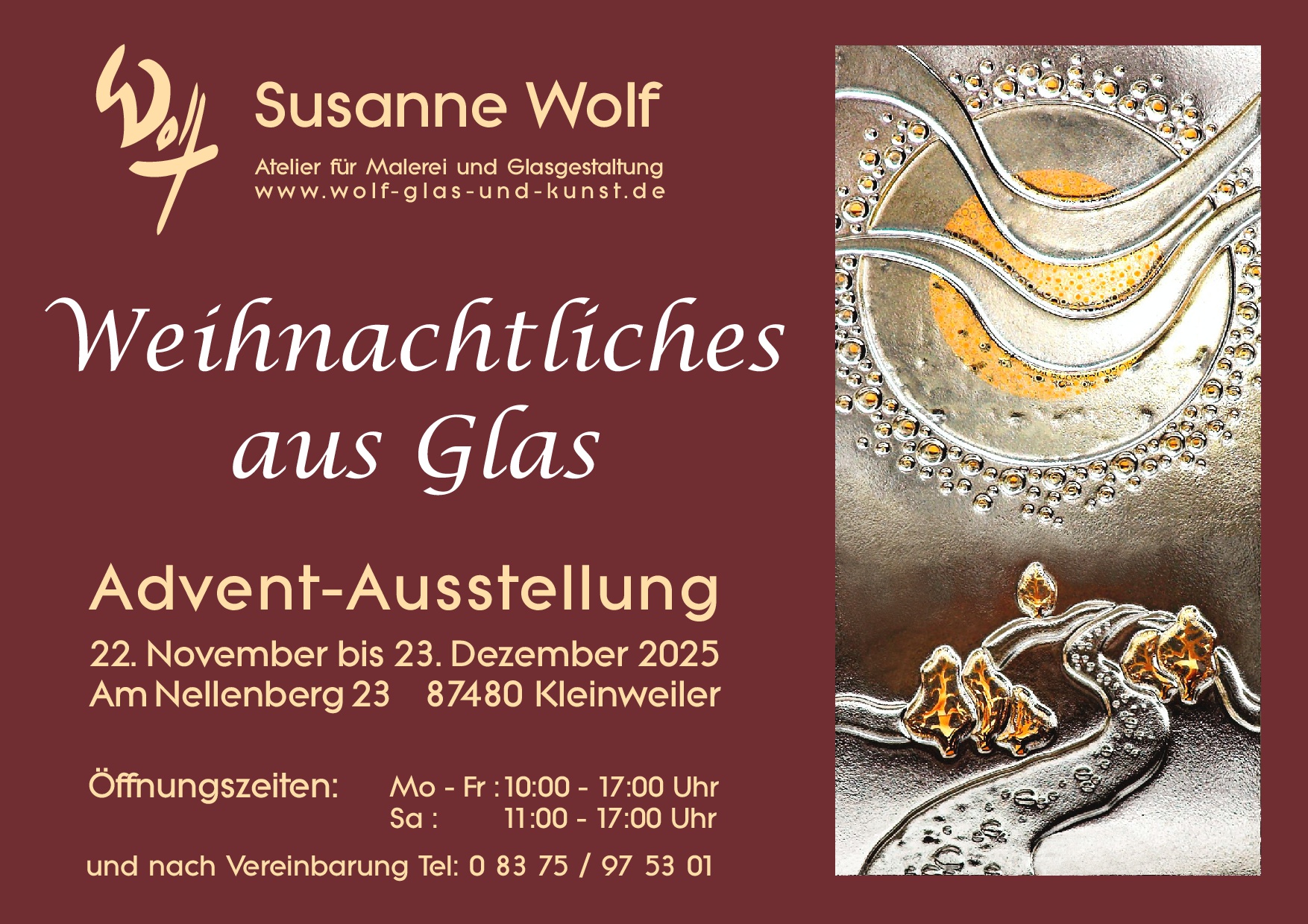 Meine Galerie habe ich neu gestaltet und kleine „Kunststücke“ zur Advents – und Weihnachtszeit für Sie vorbereitet. Ab 22. November bis 23. Dezember ist die Galerie Mo – Fr: 10.00 -17:00 Uhr und zusätzlich Sa: 11.00 -17:00 Uhr für Sie geöffnet – oder Sie vereinbaren einen Besuchstermin mit mir.
